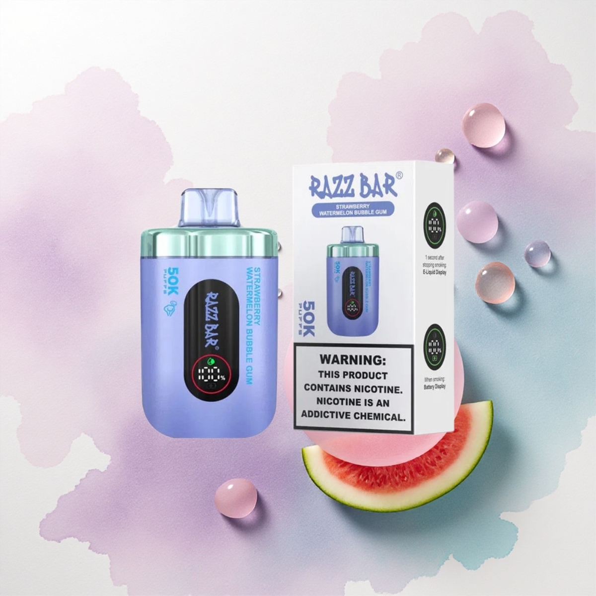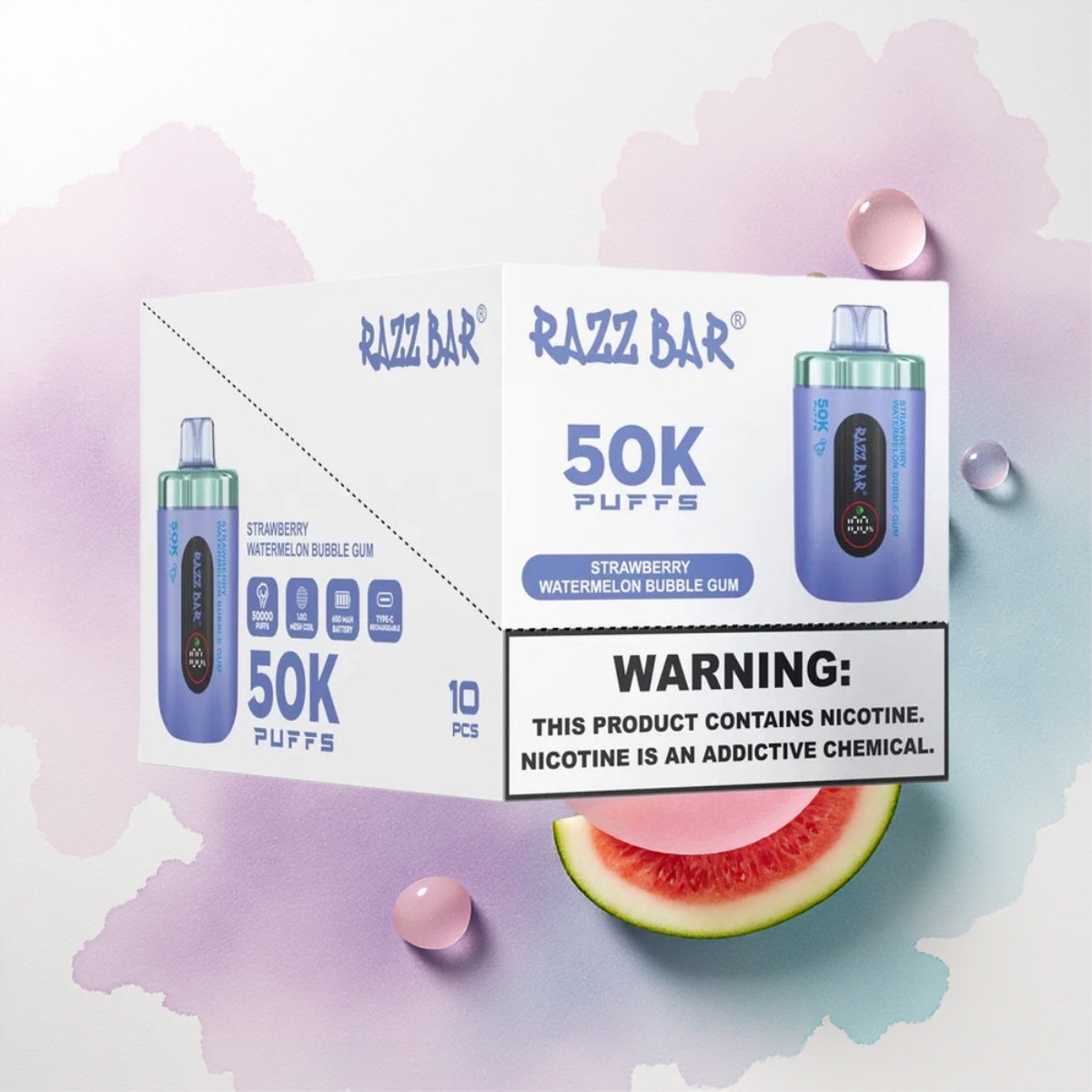Razz Bar 50K Puffs Eper Görögdinnye Buborék Rágó 1.0 Ohm Mesh Coil 650 mAh 2% Nikotin